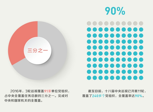 2016年,巡视工作节奏更快、力度更大,3轮巡视覆盖91家单位党组织,占中央全覆盖任务总数的三分之一,继完成对地方、国有重要骨干企业、中央金融单位全覆盖之后,又完成了对中央和国家机关的全覆盖。