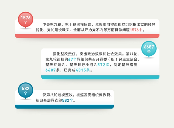 针对巡视反馈的问题,强化整改责任,突出政治效果和社会效果。第八轮、第九轮巡视的67个党组织已召开党委(组)民主生活会、整改专题会、整改领导小组会572次,制定整改措施6687条,完成4315条。仅第八轮整改,被巡视党组织就恢复、新设基层党支部582个。