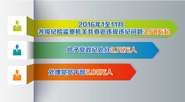 “在坚持中深化、在深化中坚持,让中央八项规定精神落地生根。”根据年初中央纪委六次全会部署,2016年,各级纪检监察机关聚焦监督执纪问责,不断坚持深化,对于不收手不知止、继续顶风违纪的,发现一起查处一起,一批违反中央八项规定精神典型问题被查处。2016年1至11月,各级纪检监察机关共查处违规违纪问题3.58万起,处理党员干部5.08万人,给予党政纪处分3.75万人。